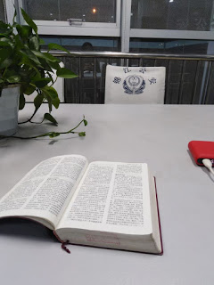 Jia Xuewei of Early Rain Covenant Church read the Bible at the police station.
