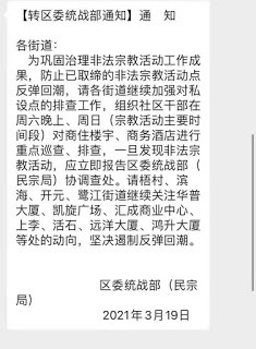 (Xiamen, Fujian Province—March 24, 2021) On March 19, Siming District United Front Work Department sent a notice to each neighborhood committee, asking them to strengthen the screening of unregistered churches. Consolidating the prohibition of "illegal religious activities," the lead department asserts, will help prevent the recurrence of banned religious activities.