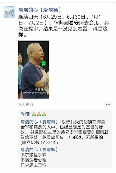 The last time his attorney met with him on June 4, Elder Zhang Chunlei related his greetings to brothers and sisters in Christ, spiritual friends, and relatives. He said that he intercedes for them in prayer every day. He hopes that his relatives and friends submit him to God. He does not want them to worry about his situation, but encourages them to rather, remain joyful and hopeful.