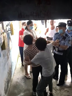 Police officers, accompanied by uncles and aunts,* threatened Christian residents, including Shu Qiong, Li Ying, Zhu Hong, Zhou Xiaoguang, and Sun Ailun. Sun Ailun, currently pregnant, had a miscarriage resulting from police violence during the massive arrest of ERCC congregants on December 9, 2018. Several aunts from the community scolded the Sun Ailun couple harshly. Xuan Bin filmed the exchange with her cell phone, however, police officers ordered her to delete the videos. When officers started to escort Xuan Bin away, Shu Qiong asked them to show the residents their warrants in accordance with laws. Otherwise, she stressed, officers should not take anyone away.
