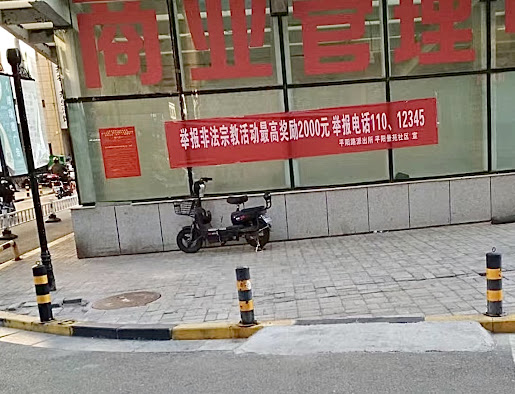(Taiyuan, Shanxi Province—September 17, 2021) Recently, Taiyuan Pingyang Road police officers and Pingyangjingyuan Community Business Center officials posted large slogans on a window, stating: "Report illegal religious activities and receive a cash reward up to ¥2,000 (310 United States Dollars). Call: 110 or 12345.”